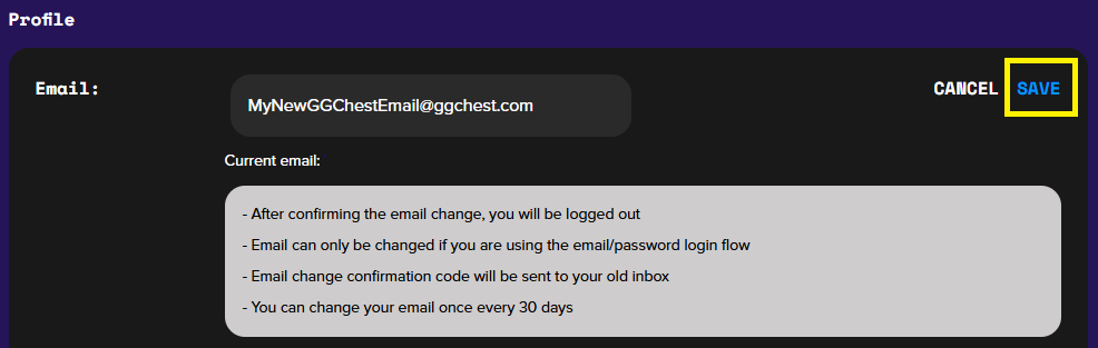 Insert a new email address, then insert a 6-digit email change confirmation code (sent to your updated email address) in the "Code" field