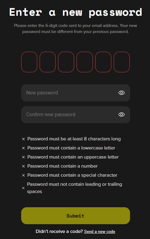 Create and confirm your new password (your new password must be different from the previous ones)